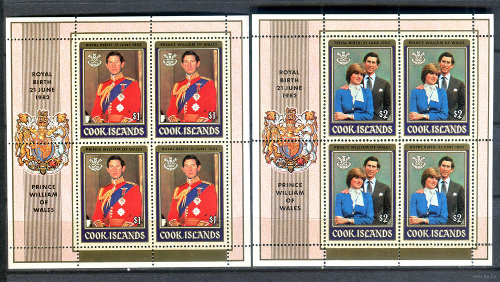 Острова Кука - 1982г. - принц Чарльз, принцесса Диана, рождение принца Уильяма - 2 малых листа - полная серия, MNH [Mi 818-821]. #3-WB-Z-2-16