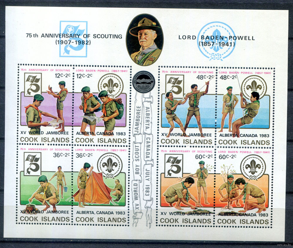 Острова Кука - 1983г. - 75 лет скаутскому движению, надпечатка - 1 блок - полная серия, MNH, с маленьким отпечатком на клее [Mi bl. 133]. #3-WB-Z-2-17