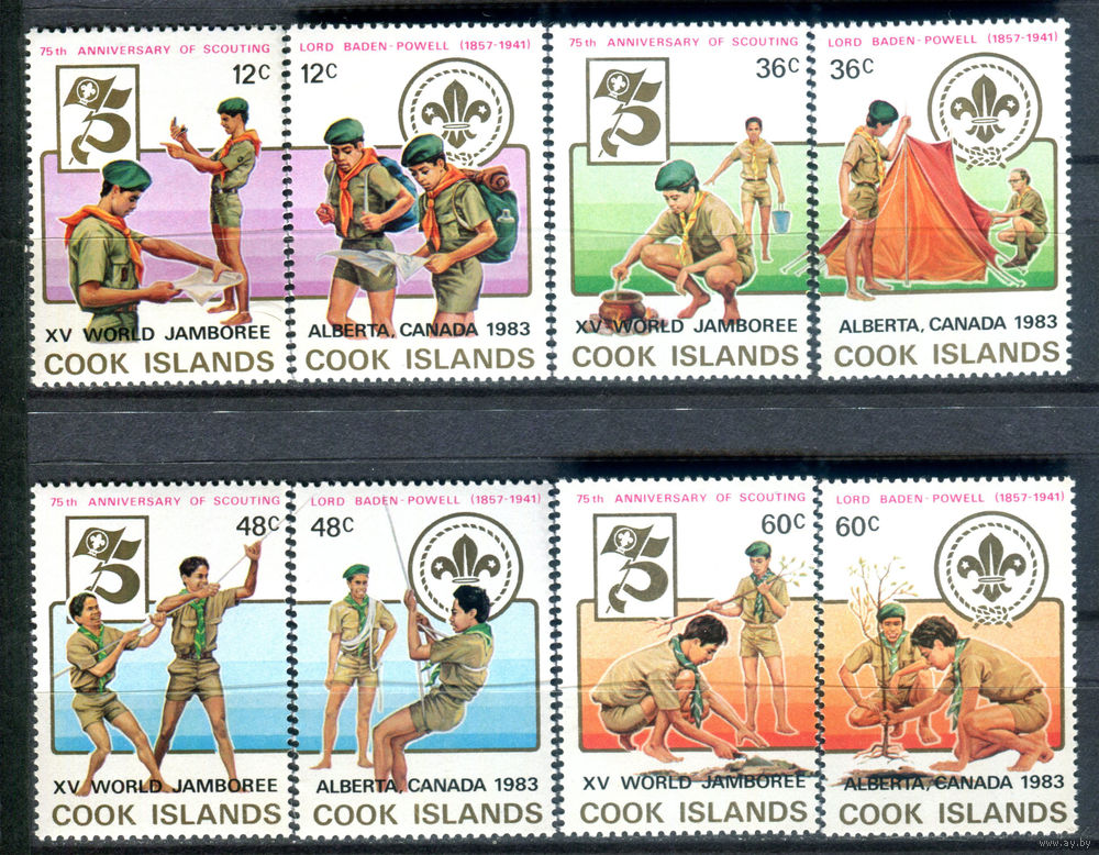 Острова Кука - 1983г. - 75 лет скаутскому движению, надпечатка - 8 марок - полная серия, MNH с отпечатками на клее, 1 марка с маленьким повреждением клея (на 2-х зубчиках перфорации) [Mi 869-876]. #3-WB-Z-1-2