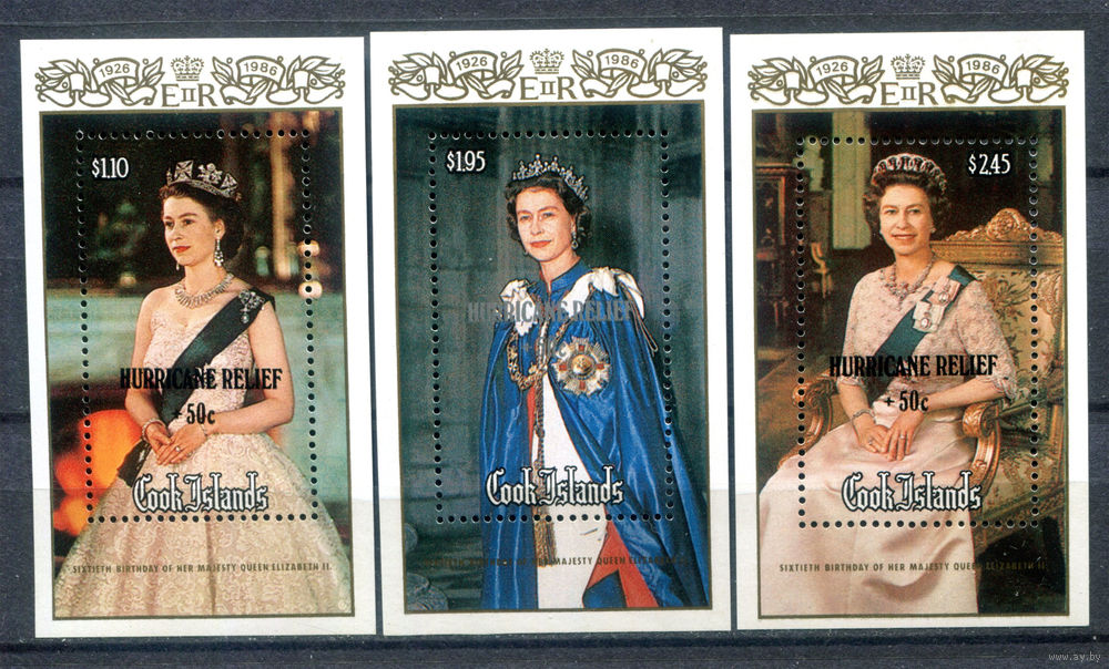 Острова Кука - 1986г. - 60-летний юбилей королевы Елизаветы II - 3 блока - полная серия, MNH [Mi bl. 167 - bl. 169]. #3-WB-Z-2-12