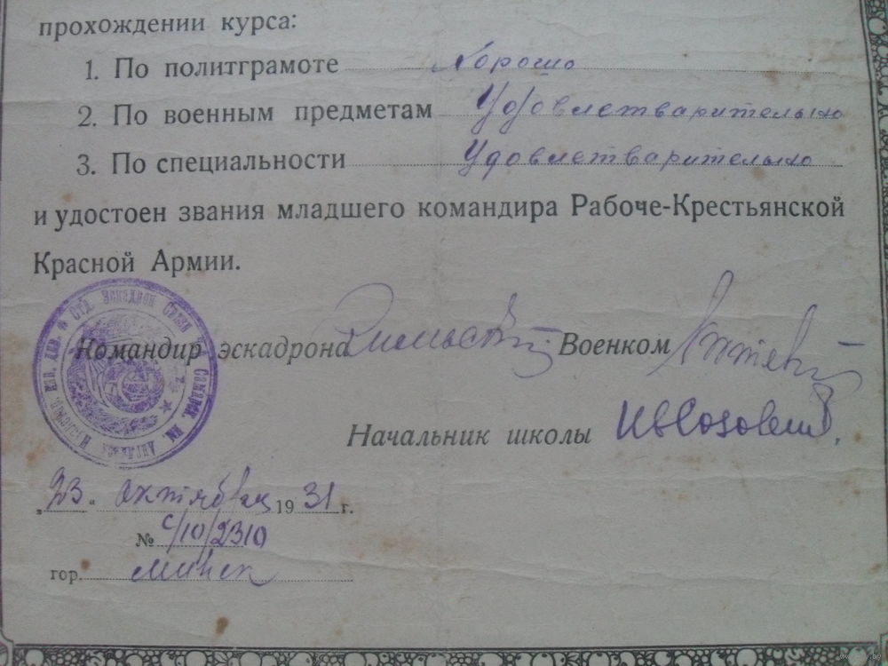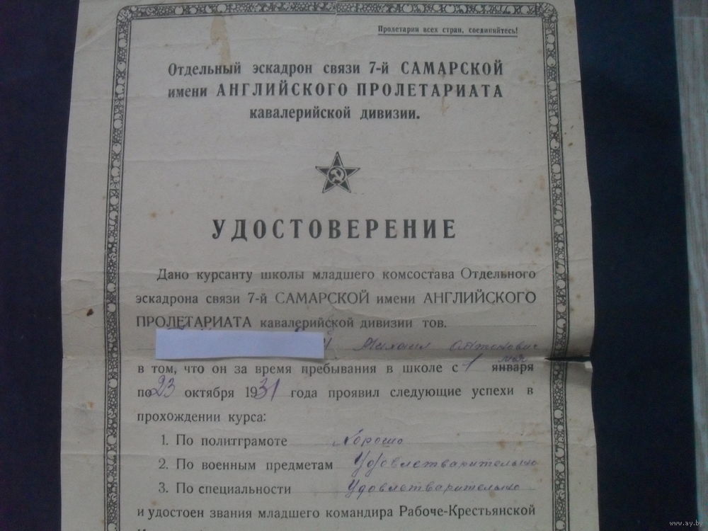 Отдельный эскадрон связи 7-й САМАРСКОЙ имени АНГЛИЙСКОГО ПРОЛЕТАРИАТА кавалерийской дивизии.УДОСТОВЕРЕНИЕ о присвоении звания младшего командира РККА.1931 г.
