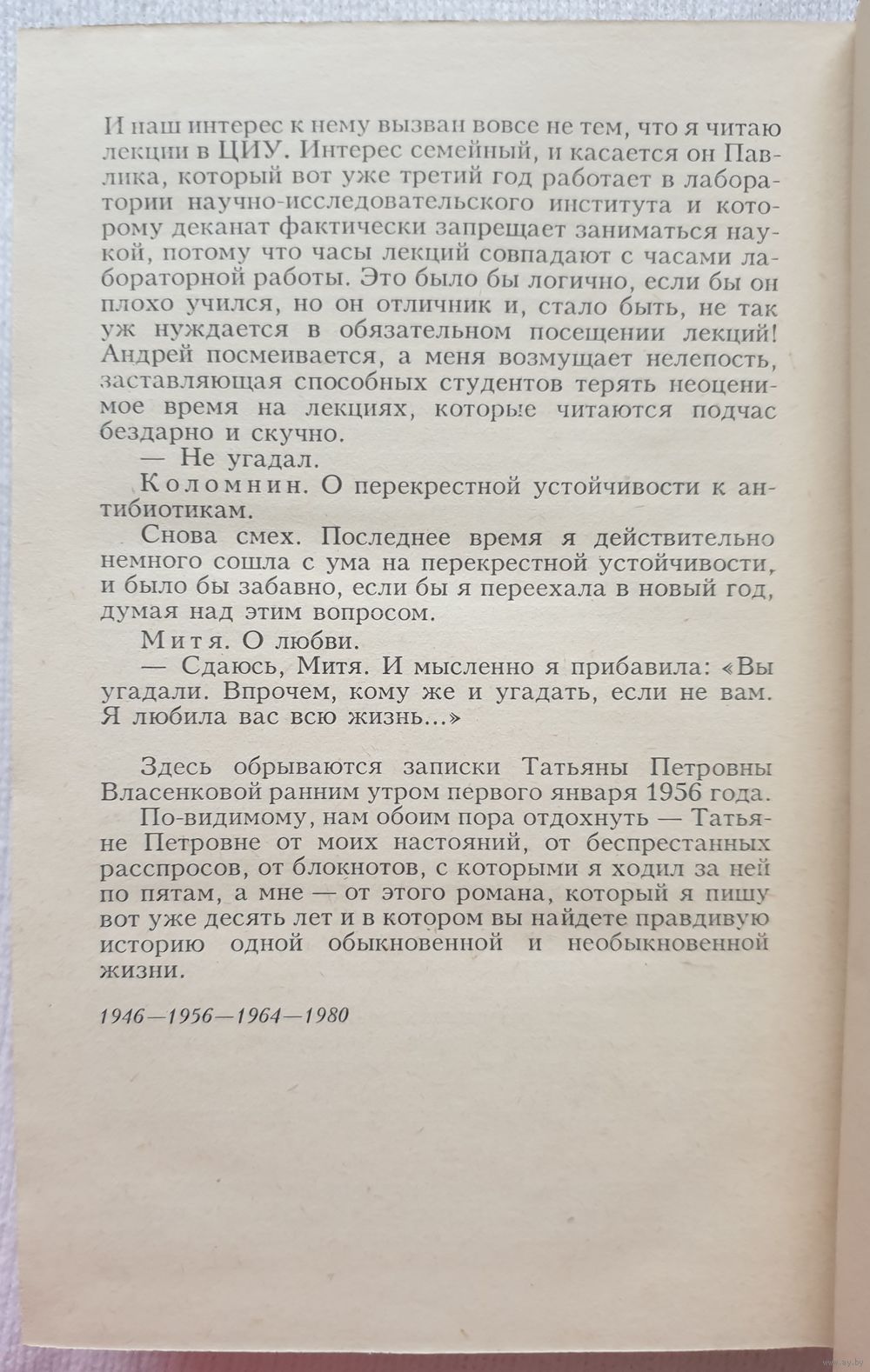 Роман рассказывает о молодом ученом Татьяне Власенковой, работающей в области микробиологии. Писатель прослеживает нелегкий, но мужественный путь героини к научному открытию, которое оказало глубокое влияние на развитие медицинской науки. Становление характера, судьба женщины-ученого дает плодотворный материал для осмысления современной молодежью жизненных идеалов.