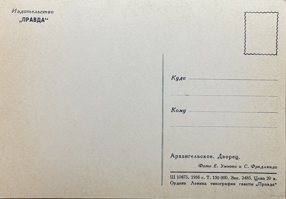 Открытка 1956 издательство Правда Архангельское Дворец фото Умнова и Фридлянда тир. 150 000