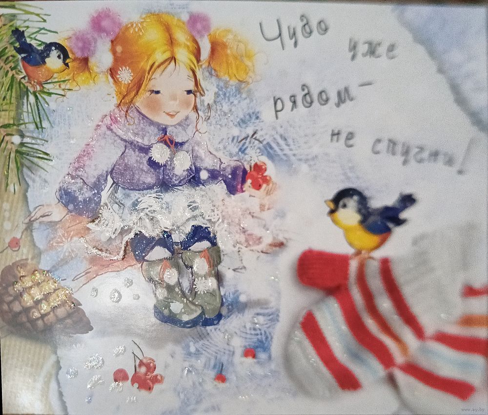 Открытка авторская Е. Бабок тиснение с глиттером девочка, птички, варежки чистая