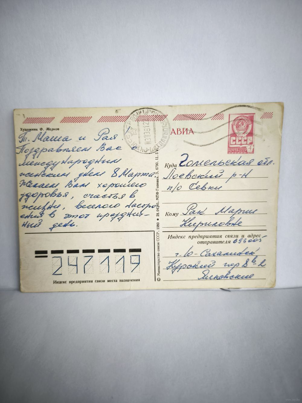 Открытка,б/у, 1980г. 8 марта (гвоздики). Художник Ф. Марков.14