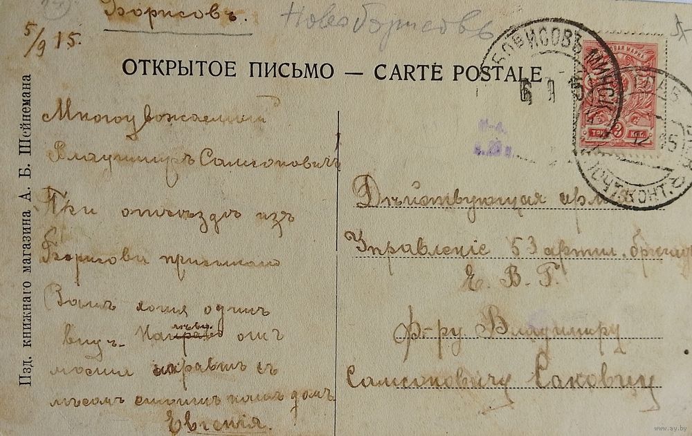 Новоборисовъ. Издание книжнаго магазина А.Б.Шейнемана. Цветная ретушь. Прошла почту 06.09.1915, марка. Адресована в Управление 53 Артил.бригады Е.И.В. Редкая!