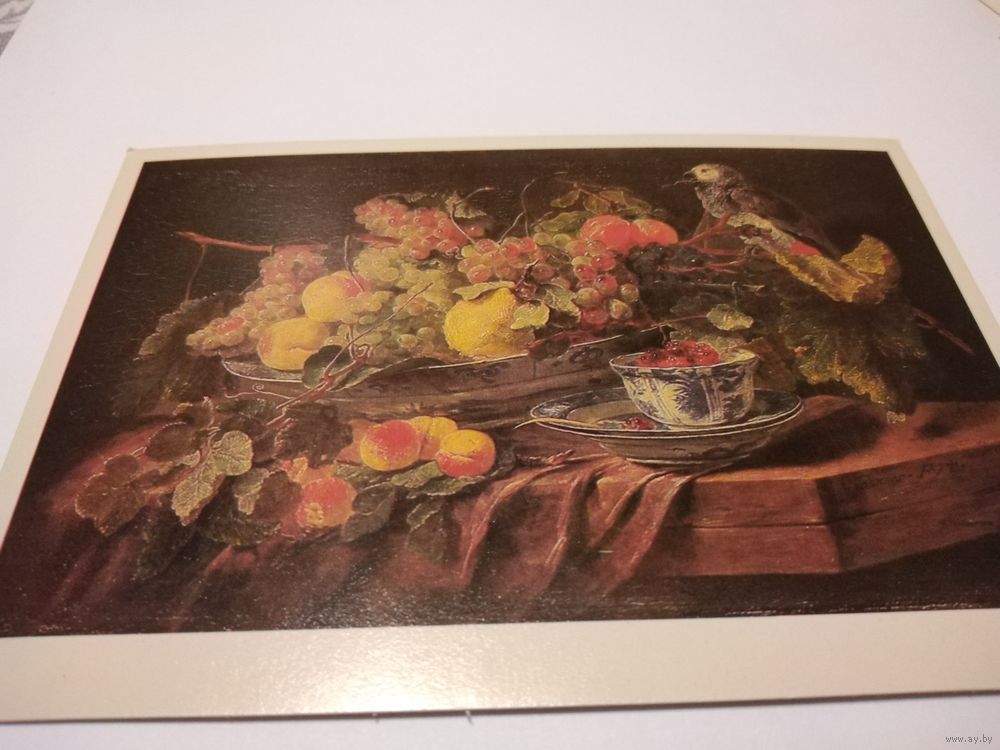 Открытка чистая 1989г. Ян Фейт. Натюрморт с цветами, фруктами и попугаем.
