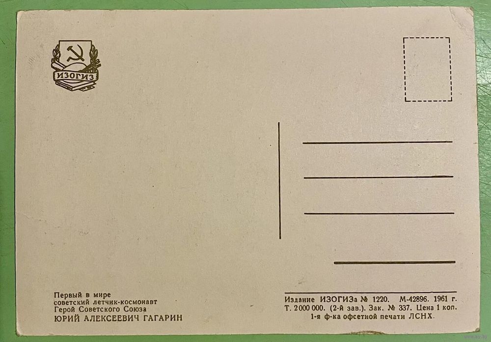 Открытка чистая СССР. "Юрий Гагарин" 1961 год.