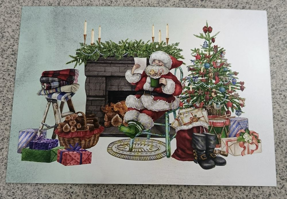 Открытка Дед Мороз у каминас письмом, елка, подарки чистая
