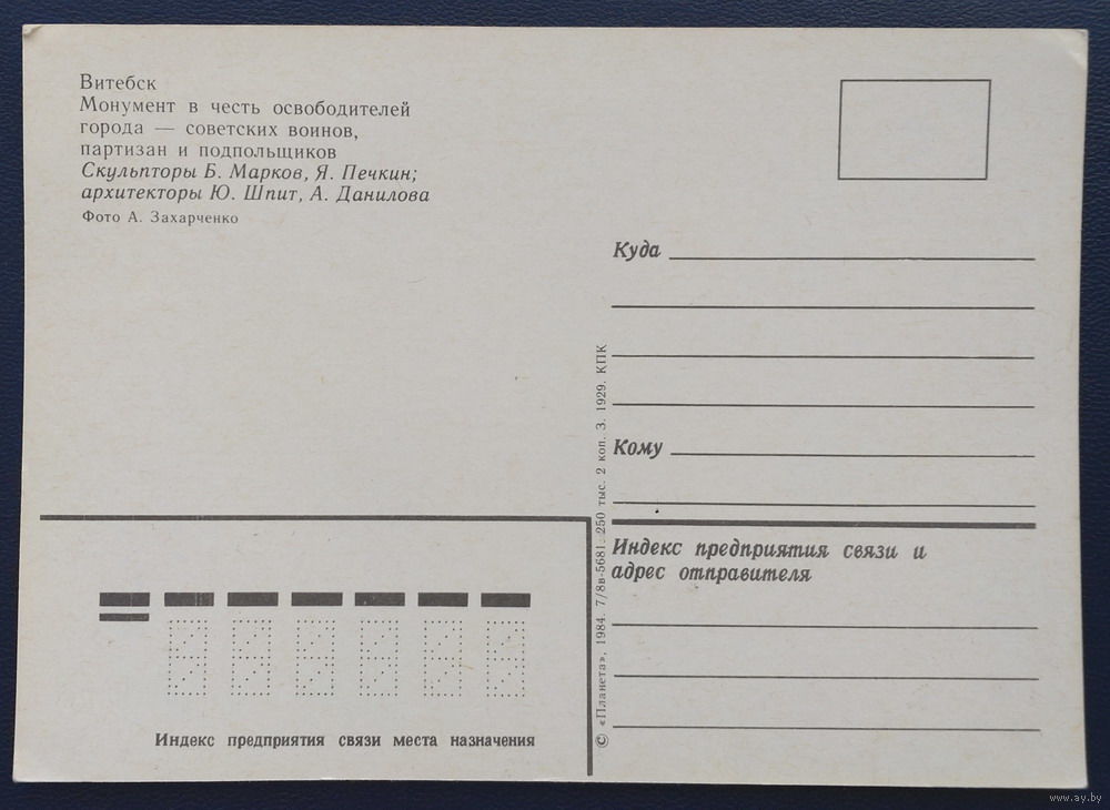 Открытка, ДПК. "Витебск. Монумент в честь освободителей города". Фото А. Захарченко, 1984, изд."Планета"