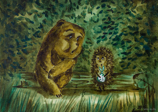Открытка. Фауна. Животные. Ёжик в тумане. Ёж. Мишка. В походе. Лето. Ночь в лесу. Мультфильм. (чистая)