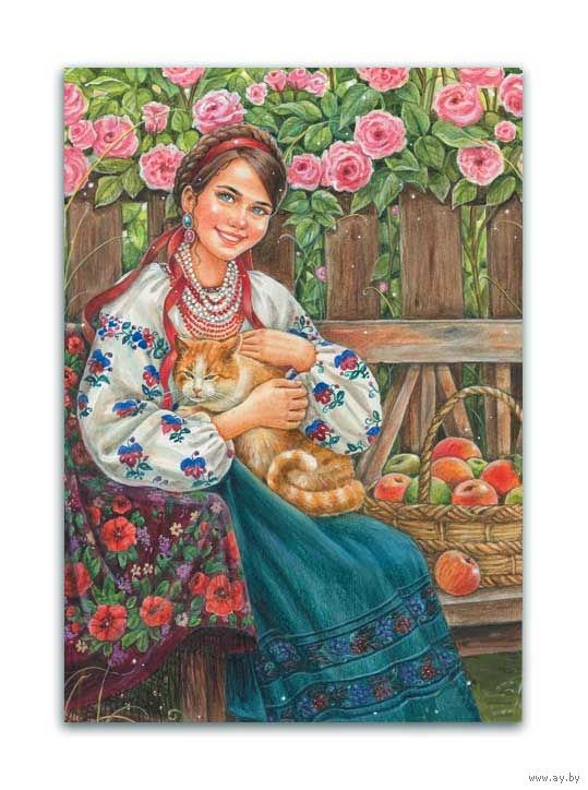 Открытка. Фольклор. Традиции. Девушка. Лето. Яблоки. Яблочный спас. Рыжий кот. Цветы, розы. Художник Е.Буторина (чистая)