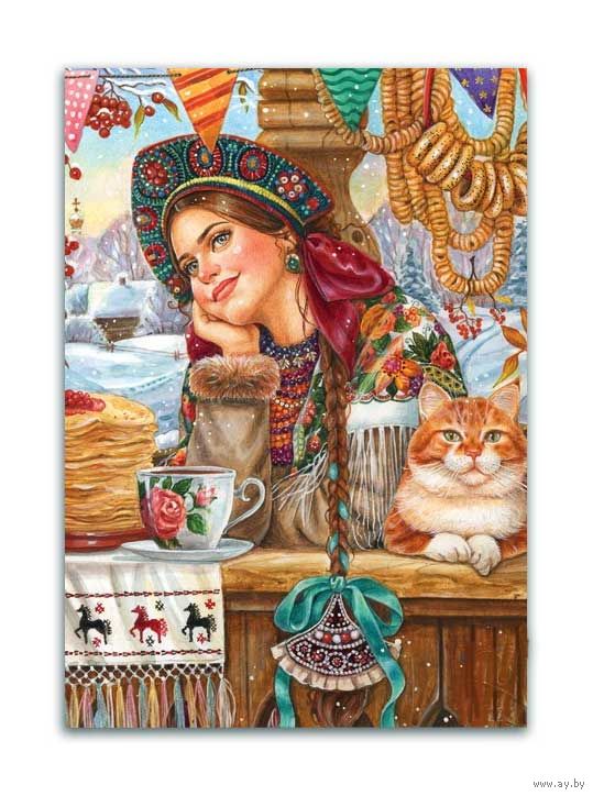 Открытка. Фольклор. Традиции. Девушка. Зима. Интерьер. Масленица. Рыжий кот. Чаепитие. Художник Е.Буторина (чистая)