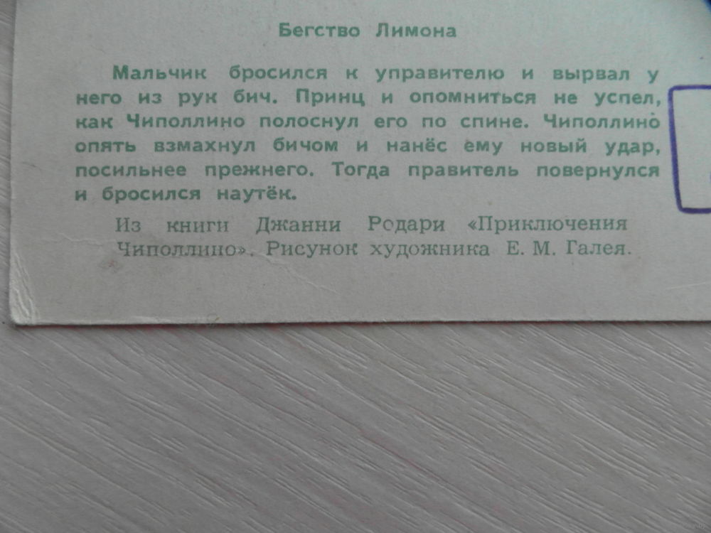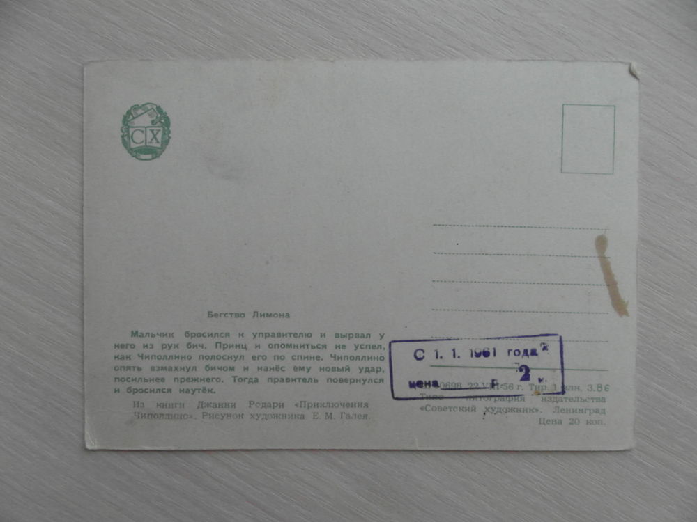 Открытка. Галей Е. М. Мультфильм. Сказка. Чиполлино. Бегство Лимона. 1956 г. Чистая.