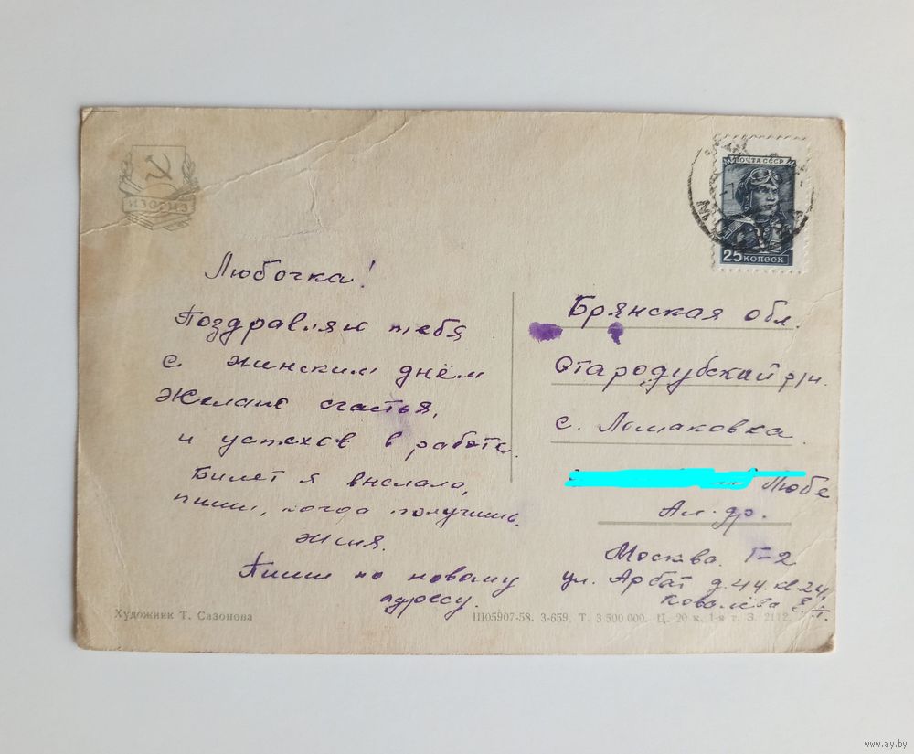 Открытка. Художник Т.Сазонова. 1958 год. Подписанная