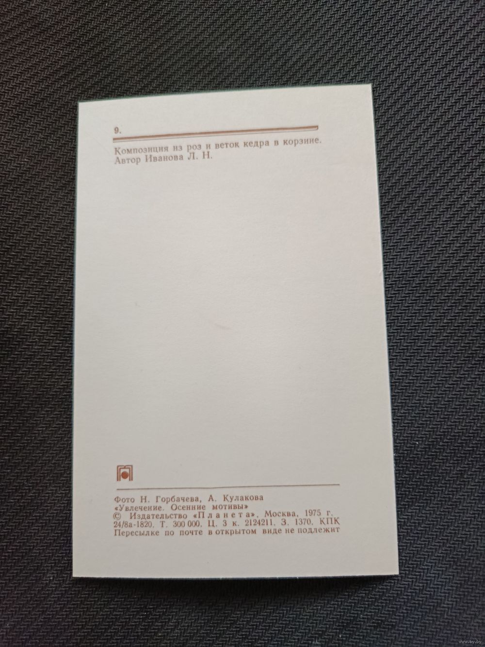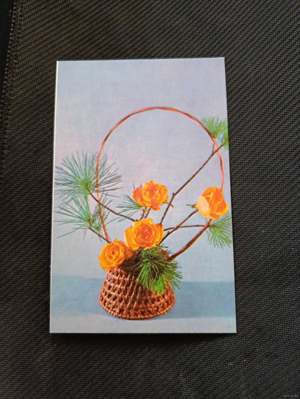 Открытка. Композиция из роз и веток кедра в корзине. 1975 г.