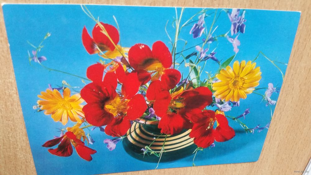 Открытка. Красные и желтые на синем.1976 год