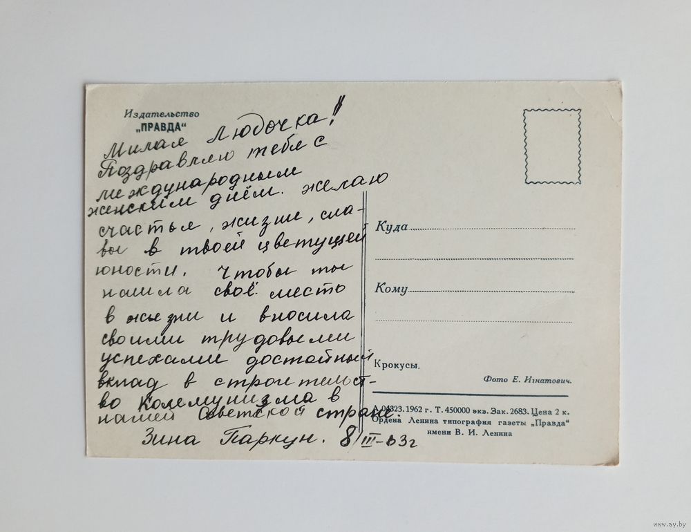 Открытка Крокусы. Фото Е.Игнатович 1962 г. Подписана