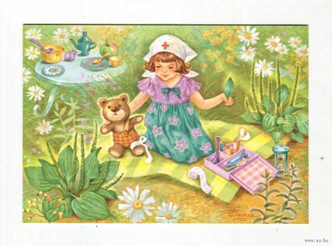Открытка. Лето. Цветы. Дети. Отдых в деревне. Игры в доктора, врач. Игрушки. Мишка. Худож. Т.Сытая (чистая)