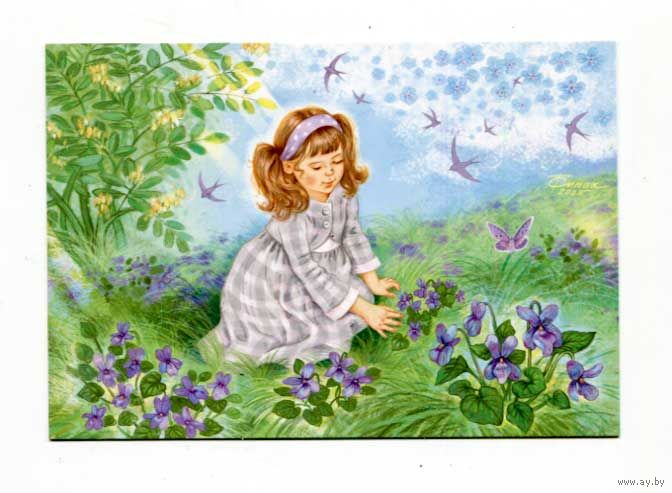 Открытка. Лето. Цветы. Дети. Отдых в деревне. Игры в траве. Фиалки. Бабочки, птицы, ласточки. Худож. Т.Сытая (чистая)