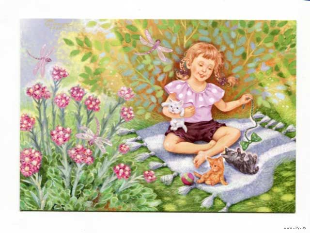 Открытка. Лето. Цветы. Дети. Отдых в деревне. Игры в траве. Уотята. Стрекоза. Худож. Т.Сытая (чистая)