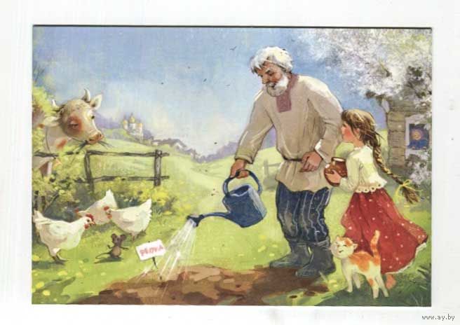 Открытка. Лето. В деревне. Хозяйство. Дедушка. Внучка. Дети. Девочка. Куры.Коровка. Котенок. Худож. Е.Бабок (чистая)