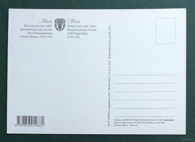 Открытка "Минск. Минская Ратуша". Фото С. Плыткевича, 2012, изд."Рифтур"