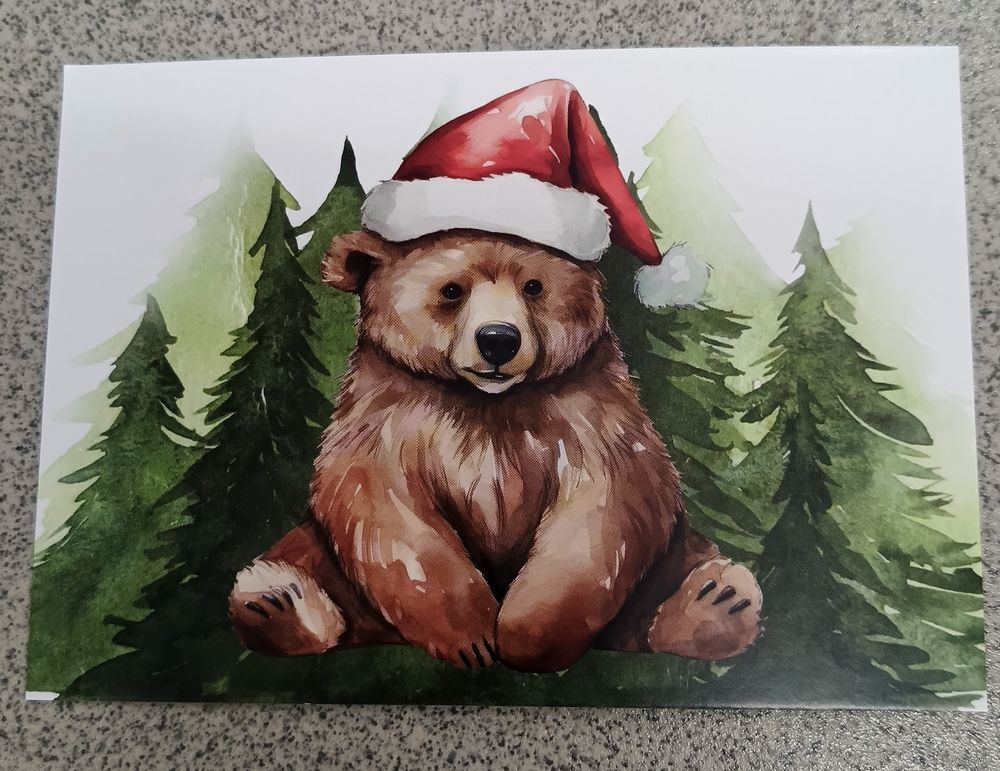 Открытка Мишка в новогоднем колпаке на фоне елок. Новый год. Чистая