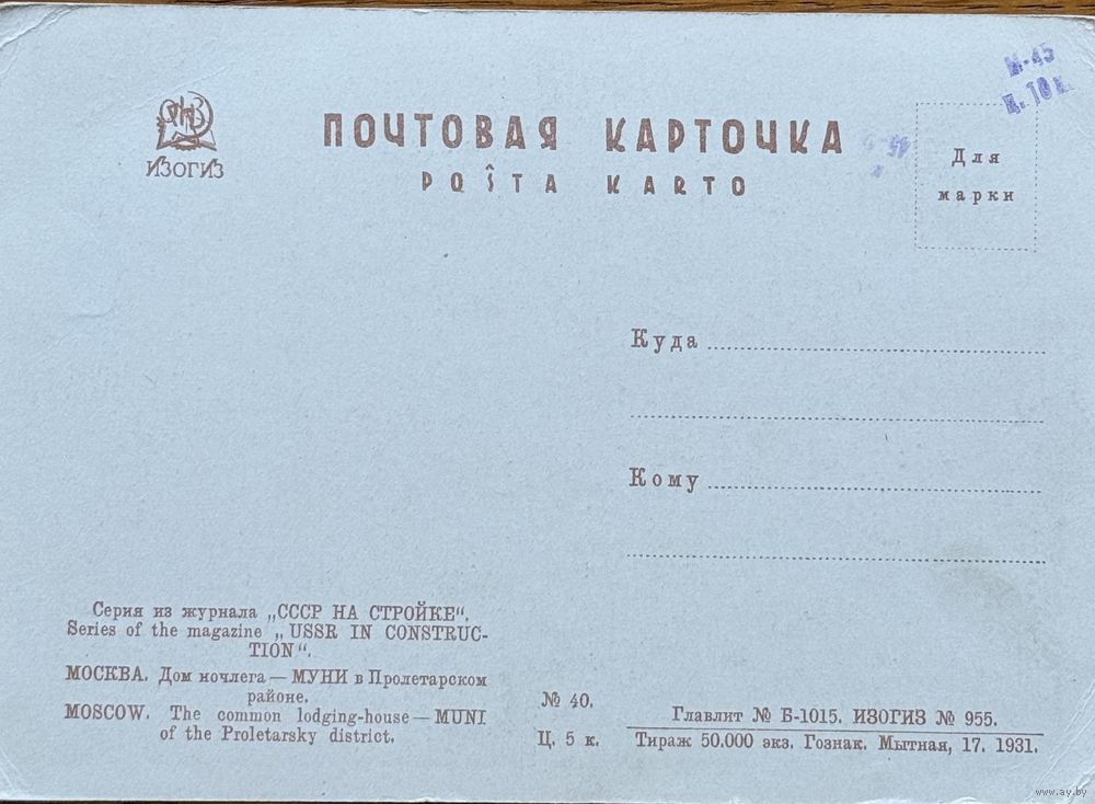 Открытка Москва Дом ночлега МУНИ в Пролетарском районе из серии СССР на стройке 1931 г т.50000