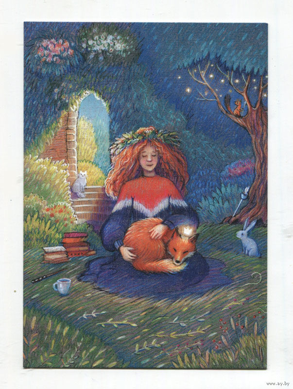 Открытка почтовая. Дети. Рыжая девочка. Лиса. Лисичка. Лето. Ночь. Худож. Л.Гнедкова (чистая)