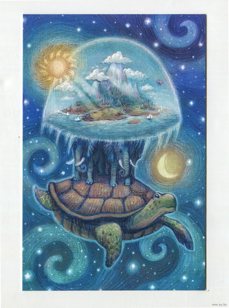 Открытка почтовая. Философия. Океан. Создание мира. Черепаха. Три слона. Планета. Земля. Худож. Л.Гнедкова (чистая)