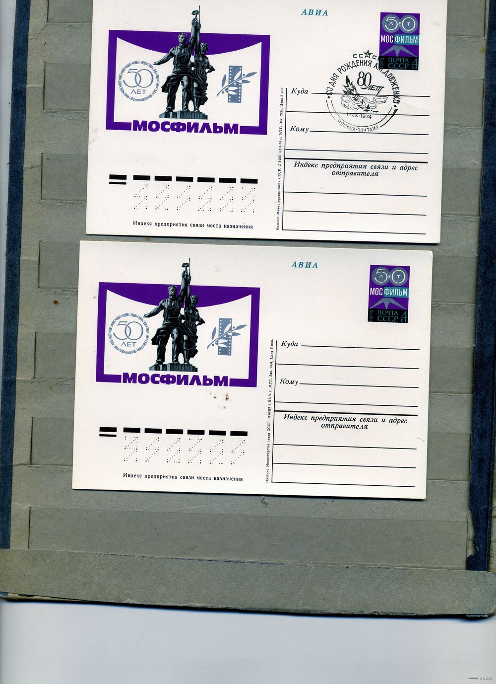 Открытка, Почтовая карточка, 1974, Заг.18, 2 шт чистая и СГ 80 лет ДОВЖЕНКО М-ва п-т