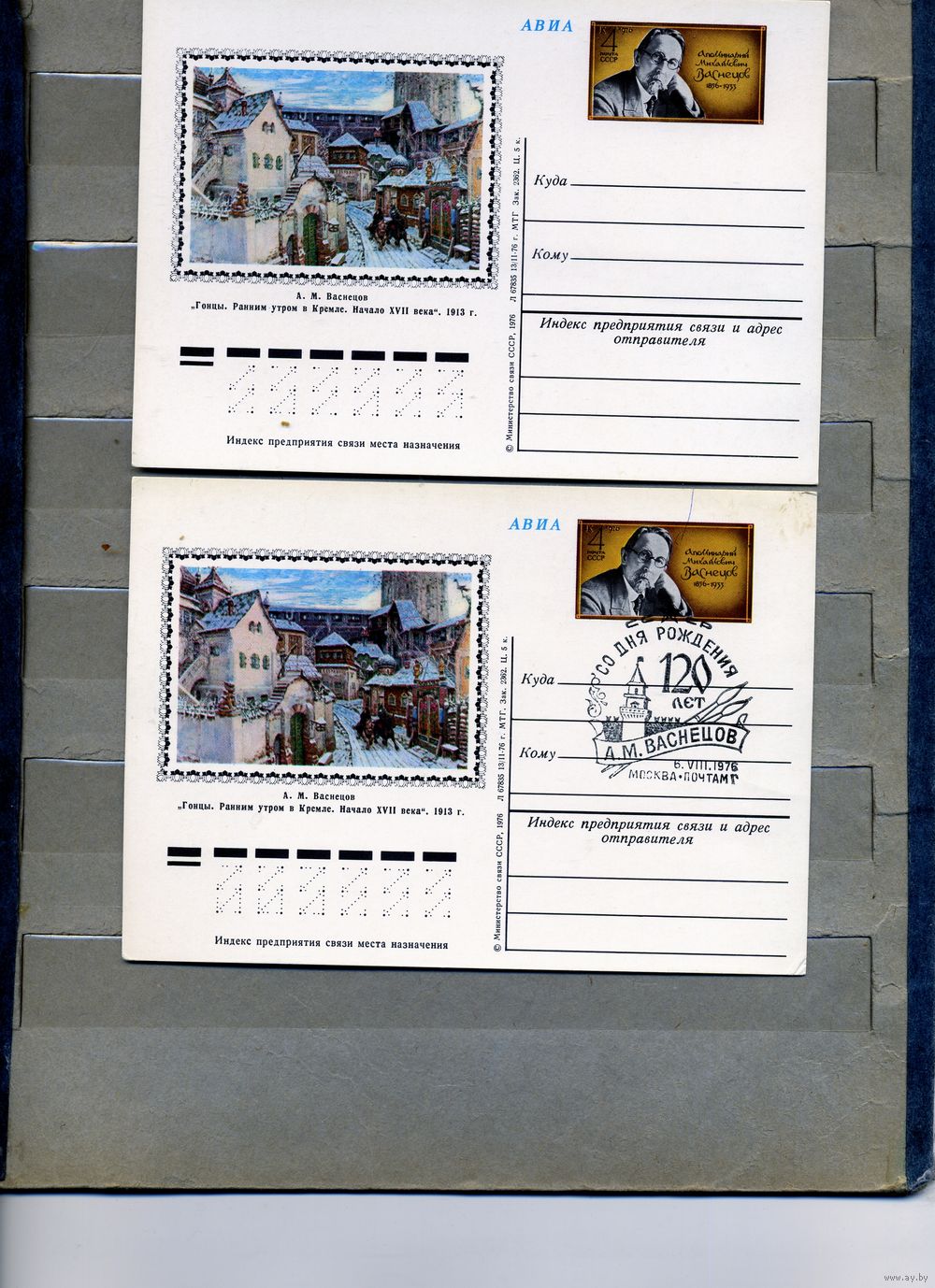 Открытка, почтовая карточка, 1976, Заг.40, 120 лет со д/р ВАСНЕЦОВА, 2шт, чистая и СГ М-ва п-т