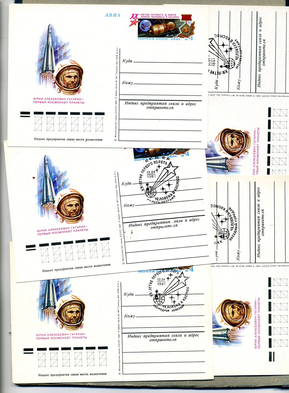Открытка, почтовая карточка, 1981, Заг. 96, 20-летие полета в космос 5 шт чистая и 4шт СГ М-ва, Звездный гор.,байконур, калуга
