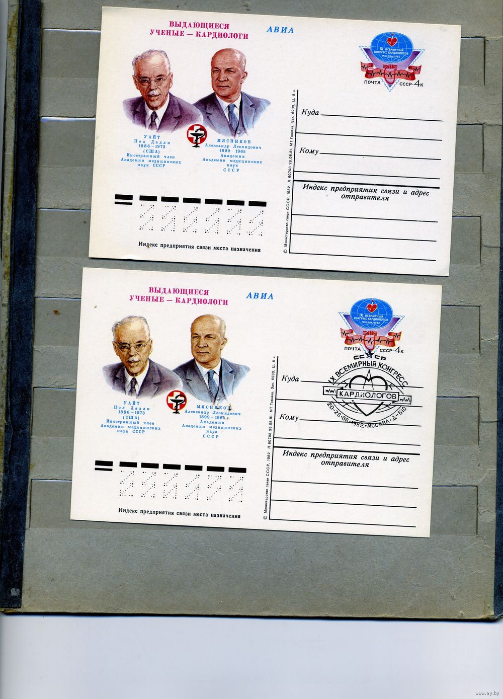Открытка, почтовая карточка, 1982, Заг. 101, КОНГРЕСС КАРДИОЛОГОВ, 2шт чистая и СГ М-ва Д-610
