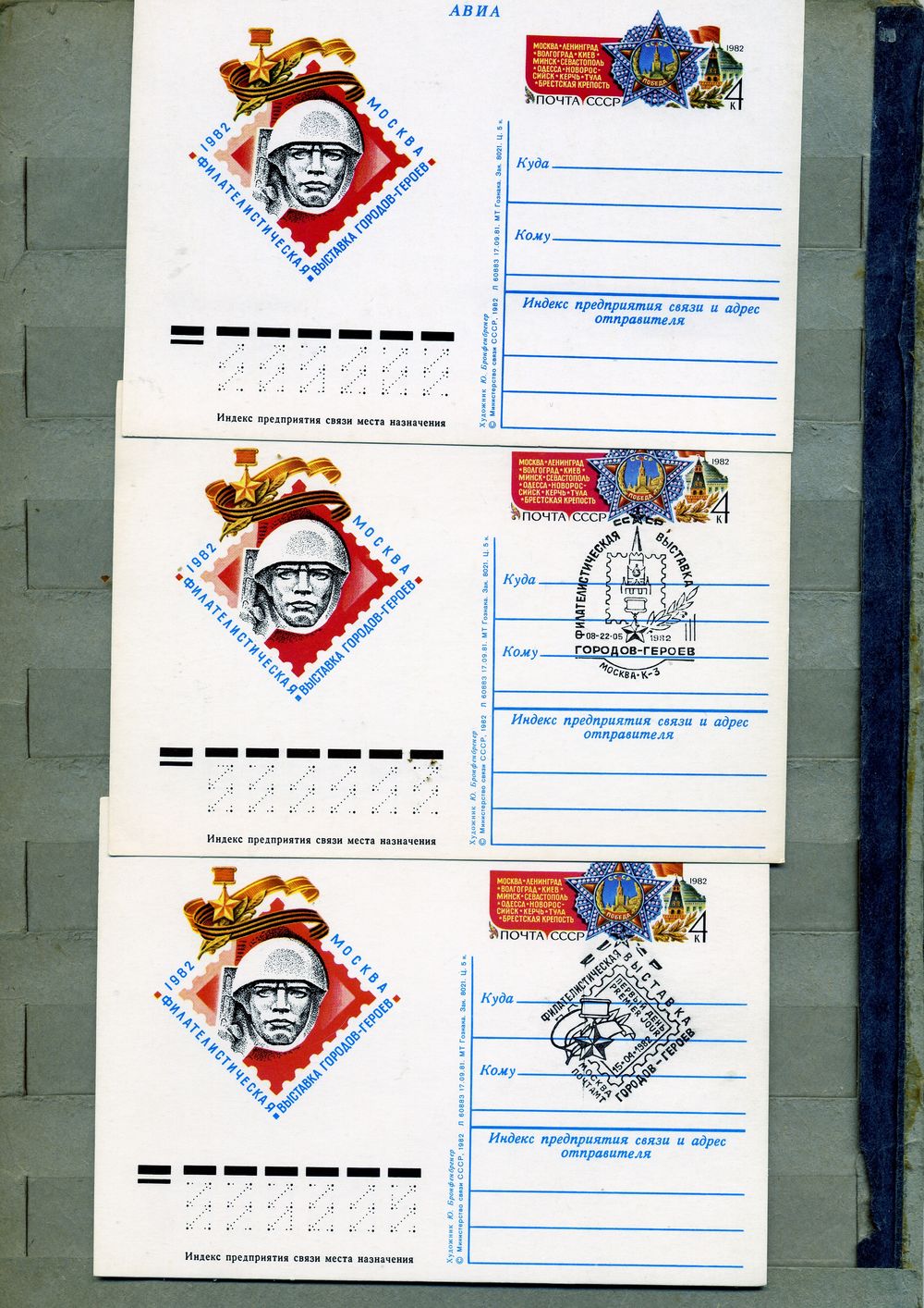 Открытка, почтовая карточка, 1982, Заг. 102, Фил. ВЫСТАВКА ГОРОДОВ-ГЕРОЕВ 3шт тая и 2шт СГ М-ва п-т, м-ва К-3