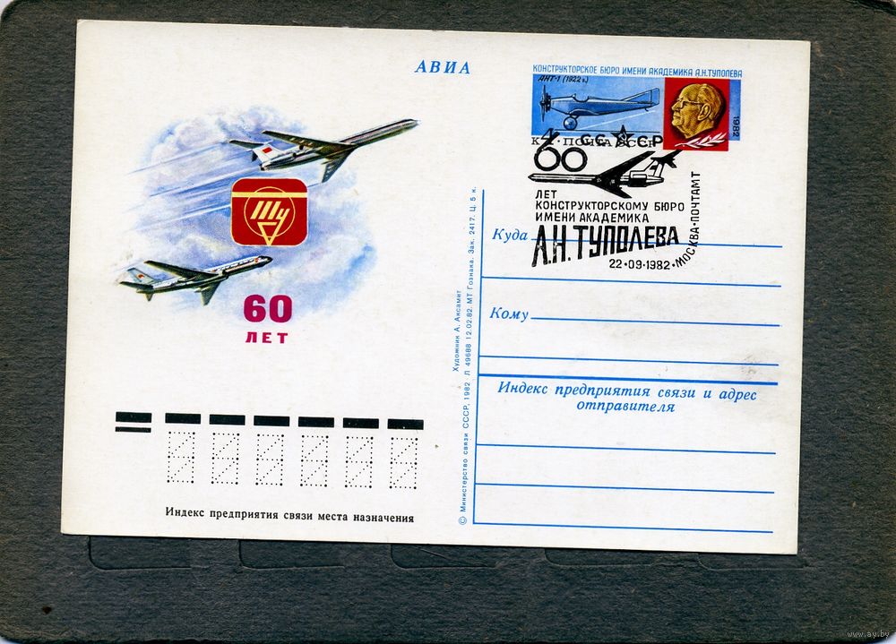 Открытка, почтовая карточка, 1982, Заг.106, 60 лет КБ им ТУПОЛЕВА