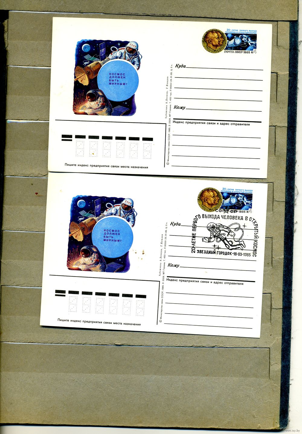 Открытка, почтовая карточка, 1985, Заг.145, 20-лете выхода в открытый космос 2шт чистая и СГ Звезд. городок