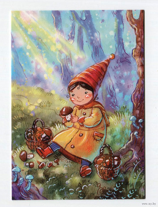 Открытка почтовая. Осень. Дети. Девочка. Грибы. Лес. Худож. А.Столбова (чистая)