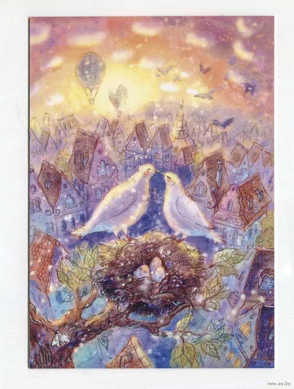 Открытка почтовая. Весна. УТро. Белые голуби. Пара. С праздником! Любовь. Город. Рассвет. Худож. А.Столбова (чистая)