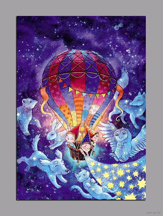 Открытка почтовая. Воздушный шар. Гномы. Фауна. ночь. Волшебство. Худож. А.Столбова (чистая)