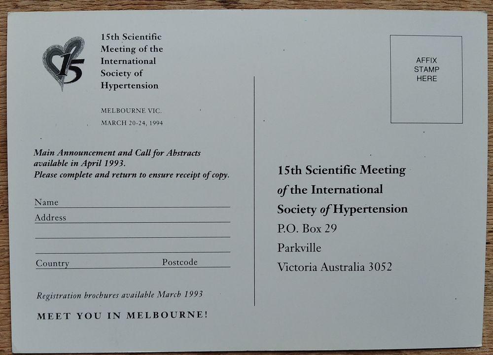 Открытка-приглашение на 15-ю научную конференцию Международного общества по гипертензии. Австралия. 1994 г.
