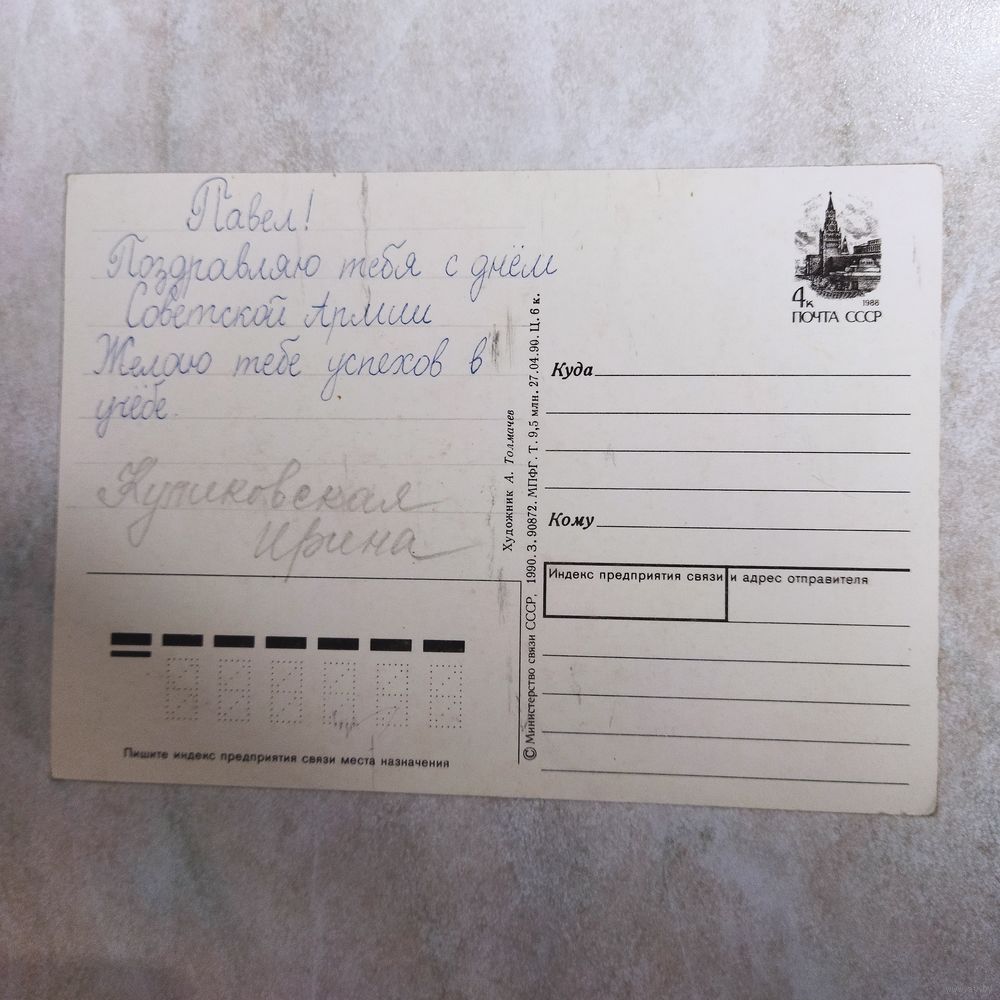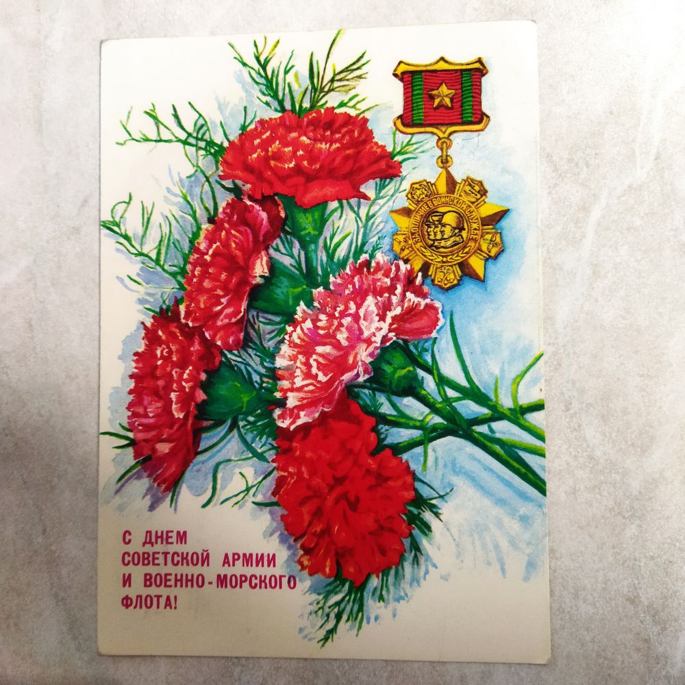 Открытка. С днём Советской армии и Военно-морского флота. Художник Толмачев. 1990 год.