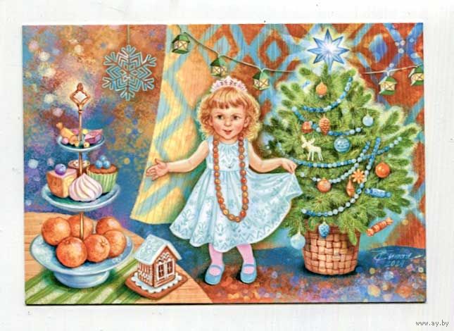 Открытка. С новым годом! Дети. Девочка. Снежинка. Игрушки на ёлке. Ёлочка. Художник Т.Сытая (чистая)