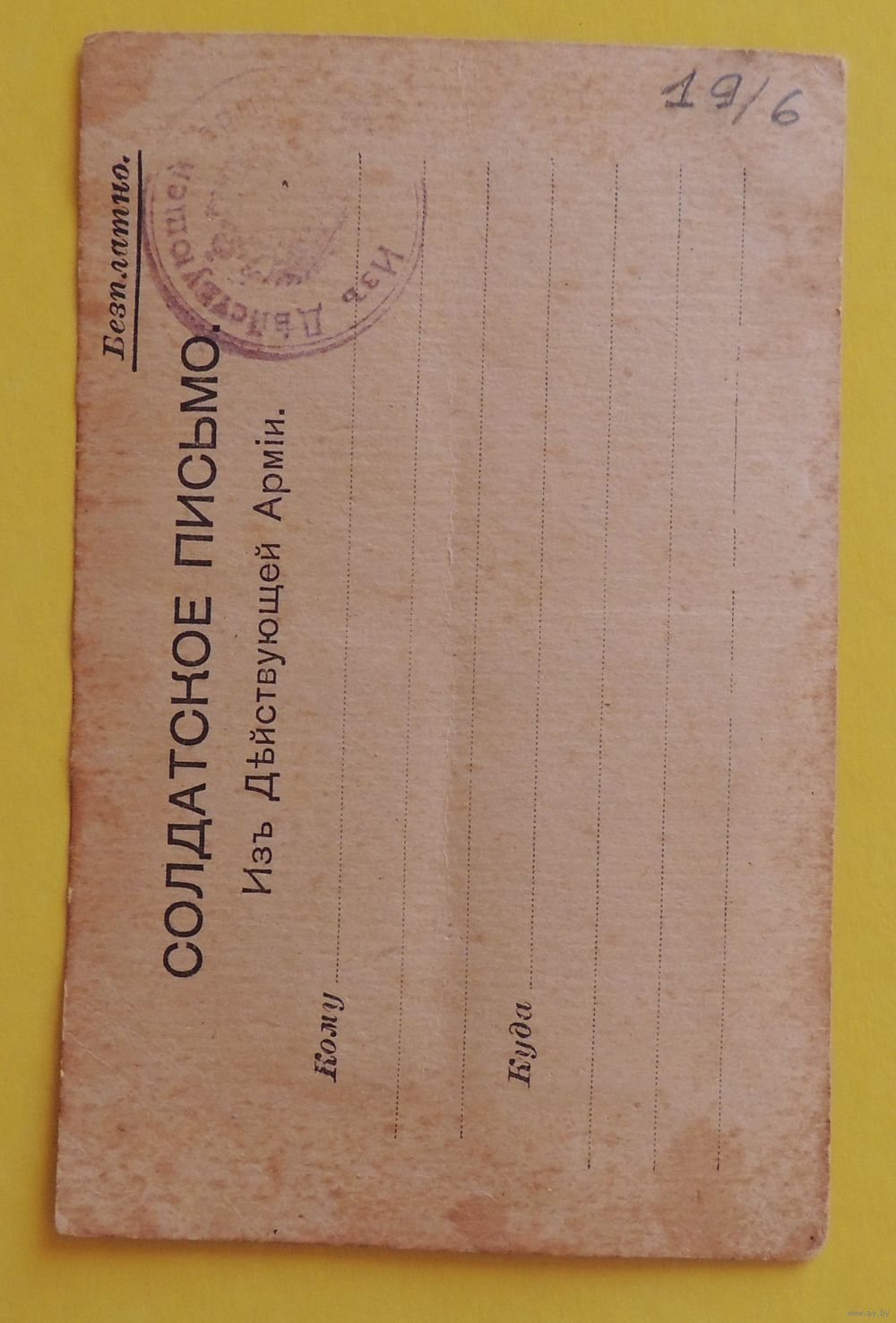 Открытка "Солдатское письмо из действующей армии", штамп до 1917 г., ПМВ