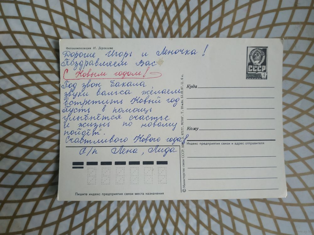 Открытка СССР 1987 год. Подписана . И.Дергилев.Состояние на скане.Тираж 18 млн.