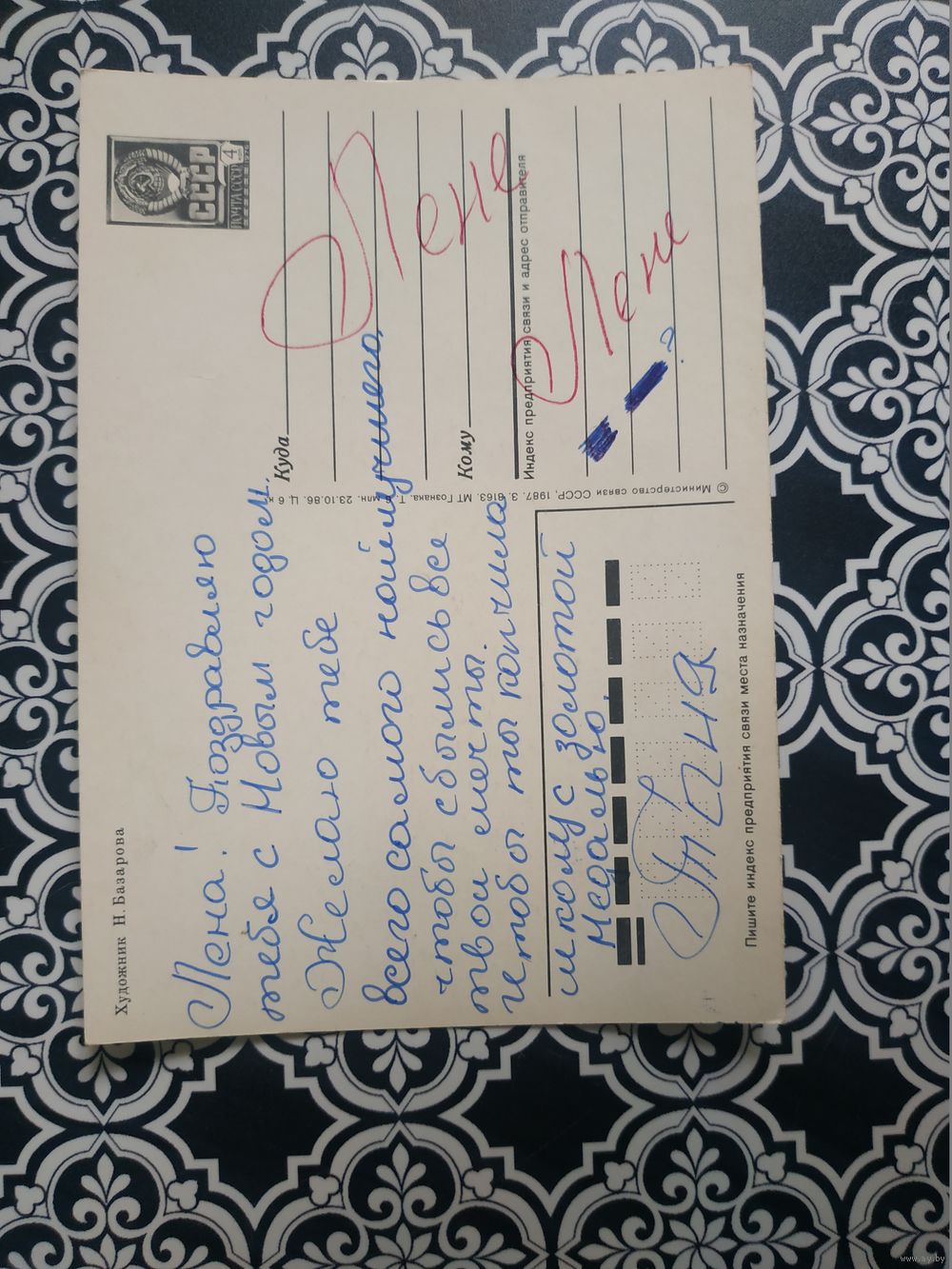 Открытка СССР 1987 год. Подписана. Н.Базарова .Состояние на скане.Тираж 6 млн.