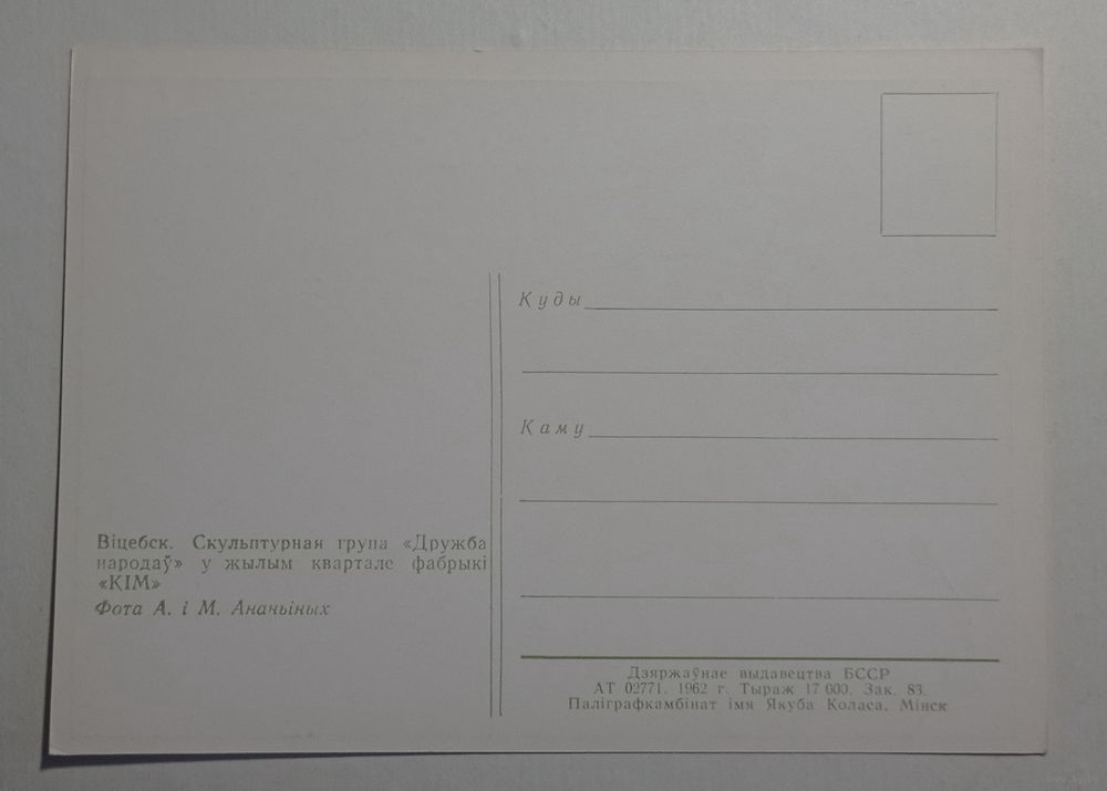 Открытка Витебск скульптурная группа Дружба народов 1962 год тираж всего 17000 фото Ананьиных