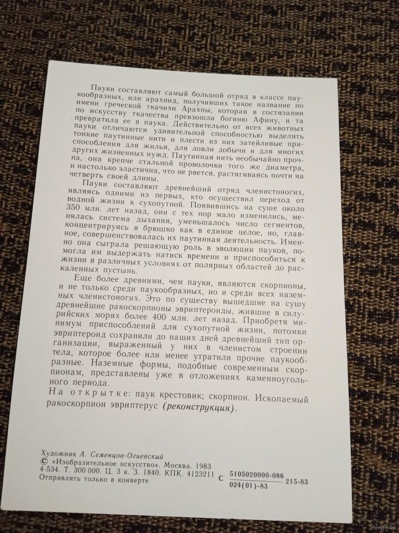 Открытка Животные .(паук-крестовик.скорпион.).1983г