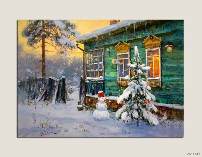 Открытка. Зима. Снеговик. Вечер. Худож. Свиридов (чистая)